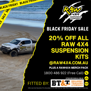 13 Nov Raw 4×4 Black Friday Sale 20% off Suspension Kits Posted at 11:21h in Uncategorized by admin_btand 0 Comments 0 Likes Upgrade your ride this Black Friday! 🚙 Get 20% off Raw 4×4 Suspension Kits at Ballarat Trailers & Towbars! Offer ends Dec 2, 2024. #OffRoadAdventure #BlackFridayDeals #SuspensionUpgrade