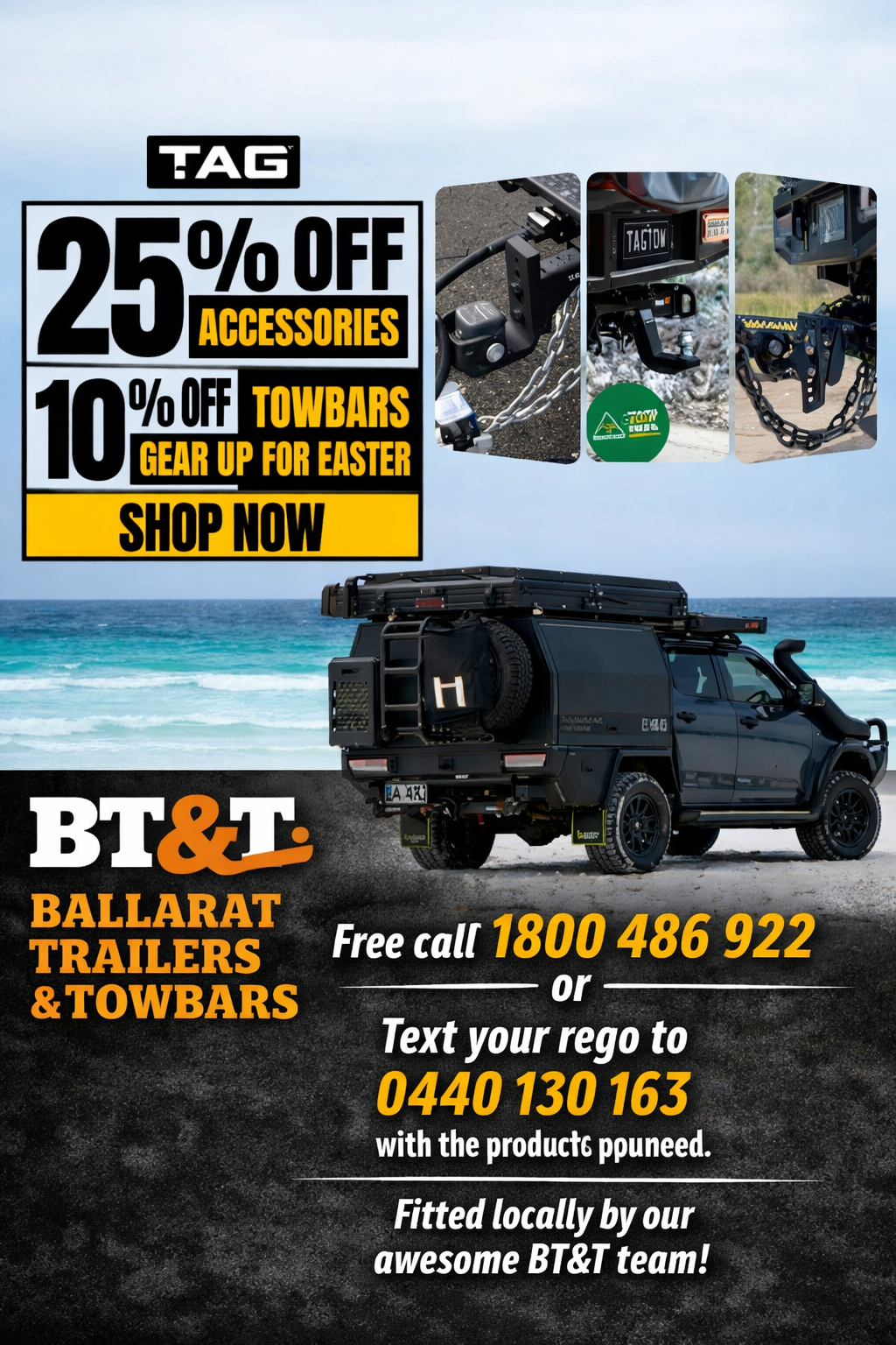 TAG Easter Sale is live! 25% off accessories, 10% off towbars. Free call 1800 486 922 or text rego to 0440 130 163 — fitted locally by BT&T. Gear up now!